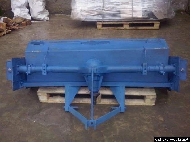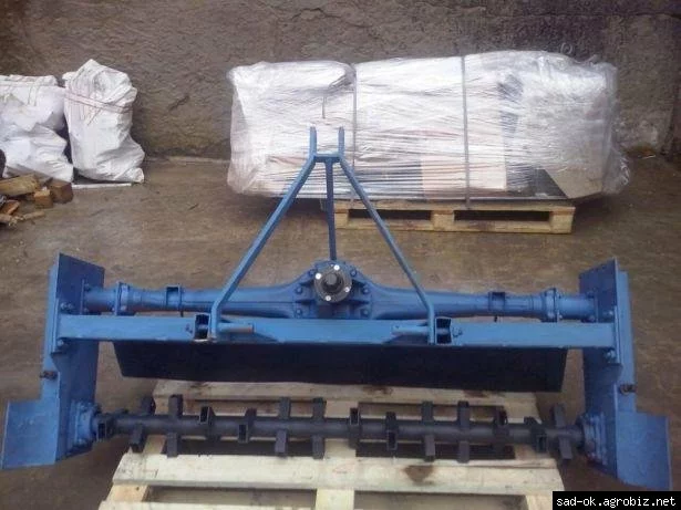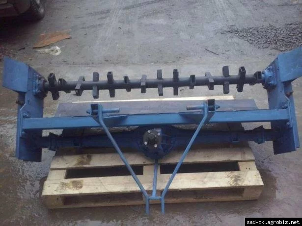 Фреза 1,8 м сделана на основе волговского или мерседесовского моста. Ножи сделаны из москвичевской рессоры. Роль редуктора исполняет двухрядный цепной привод с звездочками который находится в масляной ванне по бокам.