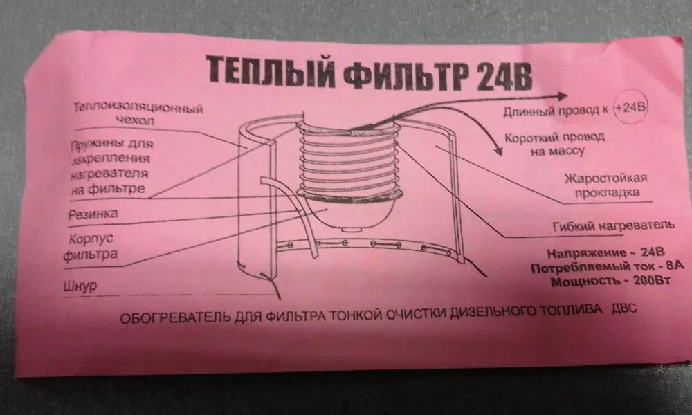 Бандажний підігрівач паливного фільтра використовується для підігрівання фільтра тонкого очищення дизельного палива. Підігрівач використовується для роботи в морозний час року, при температурі від +5 і до -40 про З. Забезпечуючи прохідність паливного фільтра за рахунок зменшення в'язкості дизельного палива і розчинення утворилися парафінів.