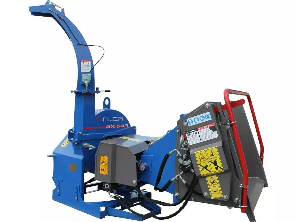 Щепоріз BX-52R від польського бренду STILER рубає дерев'яні заготовки, спиляні стволи, гілки, шпали, відходи меблевого та столярного виробництва діаметром до 12 см (максимум 25 см з корінням) на виробничу тріску розміром від 20 до 50 мм.