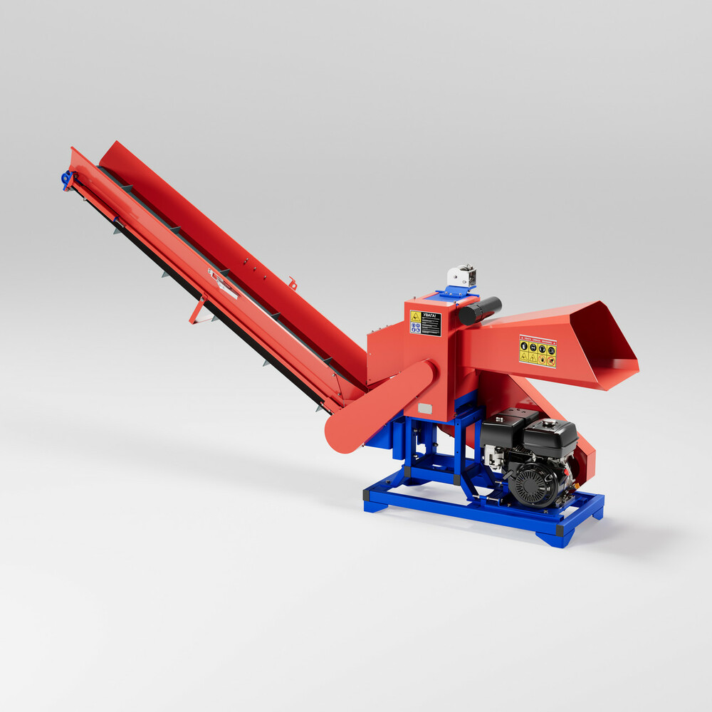 Подрібнювач гілок моделі PG-120BD-К здатний перерубати гілки м’якої породи діаметром до 12 см, гілки твердої породи діаметром до 10 см., та (плоского матеріалу) ламелей та рейок, які зможе подробити PG-120BD-К складає 6 см. Подрібнювач гілок моделі PG-120BD-К працює від бензинового двигуна, потужністю 18 к.с, що в сумі дає 10 м³ готової продукції за годину. Витрати палива (А-92) складають до 800г/год. На подрібнювачі серії К встановлена транспортувальна стрічка, за допомогою якої подрібнена сировина може подаватись на висоту до 3 метрів відразу на причіп, або кузов вантажного автомобіля, трактора, або в спеціальний контейнер, це дозволяє скоротити час завантаження та кількість персоналу. Слід зауважити, що показник продуктивності залежить від діаметру, породи, вологості, якості сировини, та кількості персоналу залученого до роботи. Подрібнювачі гілок можуть використовуватися лісовими господарствами, комунальними службами, фермерськими господарствами, сільськими, міськими радами і.т.д. Повний цикл виробництва подрібнювача гілок відбувається на нашому підприємстві. Агрегати серії PG оснащені циліндричною системою різання і трьома типами приводів. Конфігурації з шести ножів приділяється особлива увага при розробці конструкцій подрібнювачів, так як вони є основним робочим елементом подрібнювачів і на них приходить ударне навантаження. До того ж сталеві ножі термічно оброблюють задля надання їм міцності, а для безпечної експлуатації вони закриті елементами подрібнювача. Механізм гілкоподрібнювачів автоматично втягує матеріал, який потрібно різати. Ми проводимо контроль якості на всіх етапах нашого виробництва. Обов’язково шліфуються всі посадочні поверхні. Постійно контролюється якість зварних швів. Корпуси механізмів виконані з сертифікованого листа товщиною 20 мм. Перед тим, як провести фарбування, ми робимо зачистку всіх конструкцій. Покриваються подрібнювачі порошковою фарбою, що надзвичайно подовжує термін служби конструкцій. Надійний корпус забезпечує довговічність та стабільність пристроїв. Слід зауважити, що показник продуктивності залежить від діаметру, породи, вологості, якості сировини та кількості персоналу залученого до роботи. Заощаджуйте свої кошти, та використовуйте економне паливо разом з агрегатами TM PALCHE!