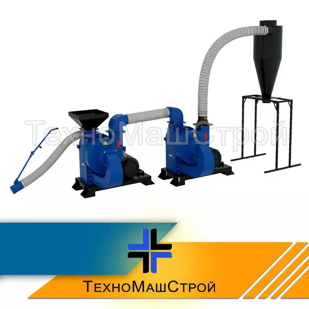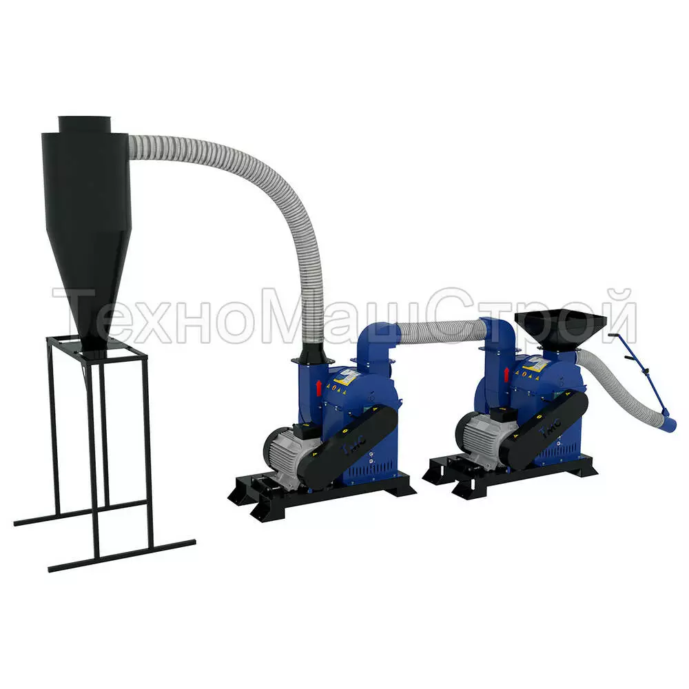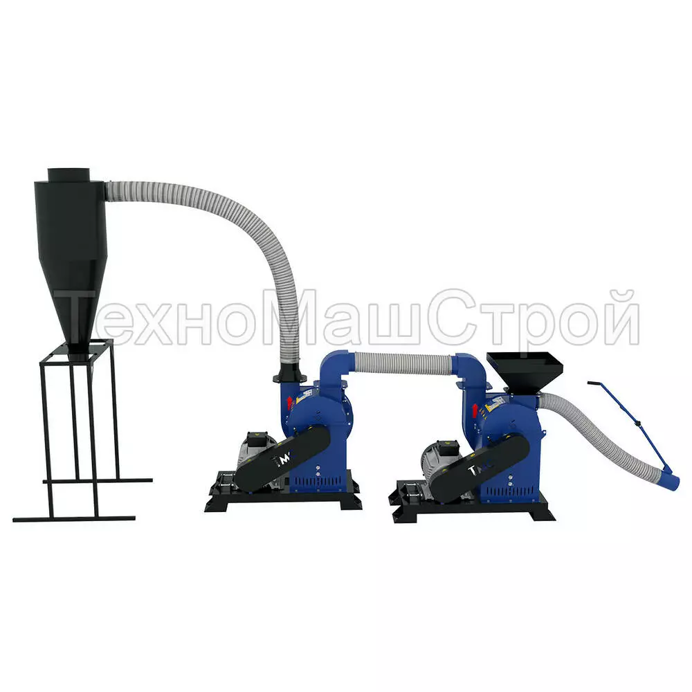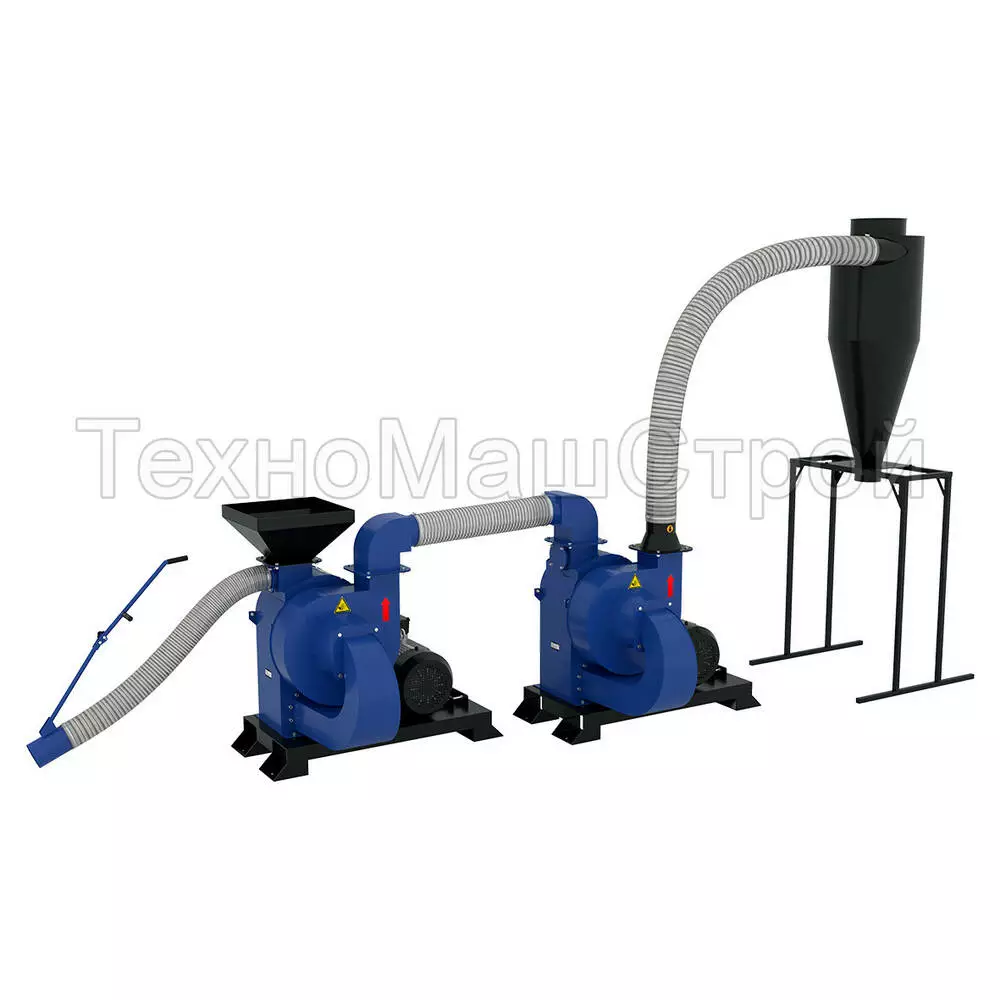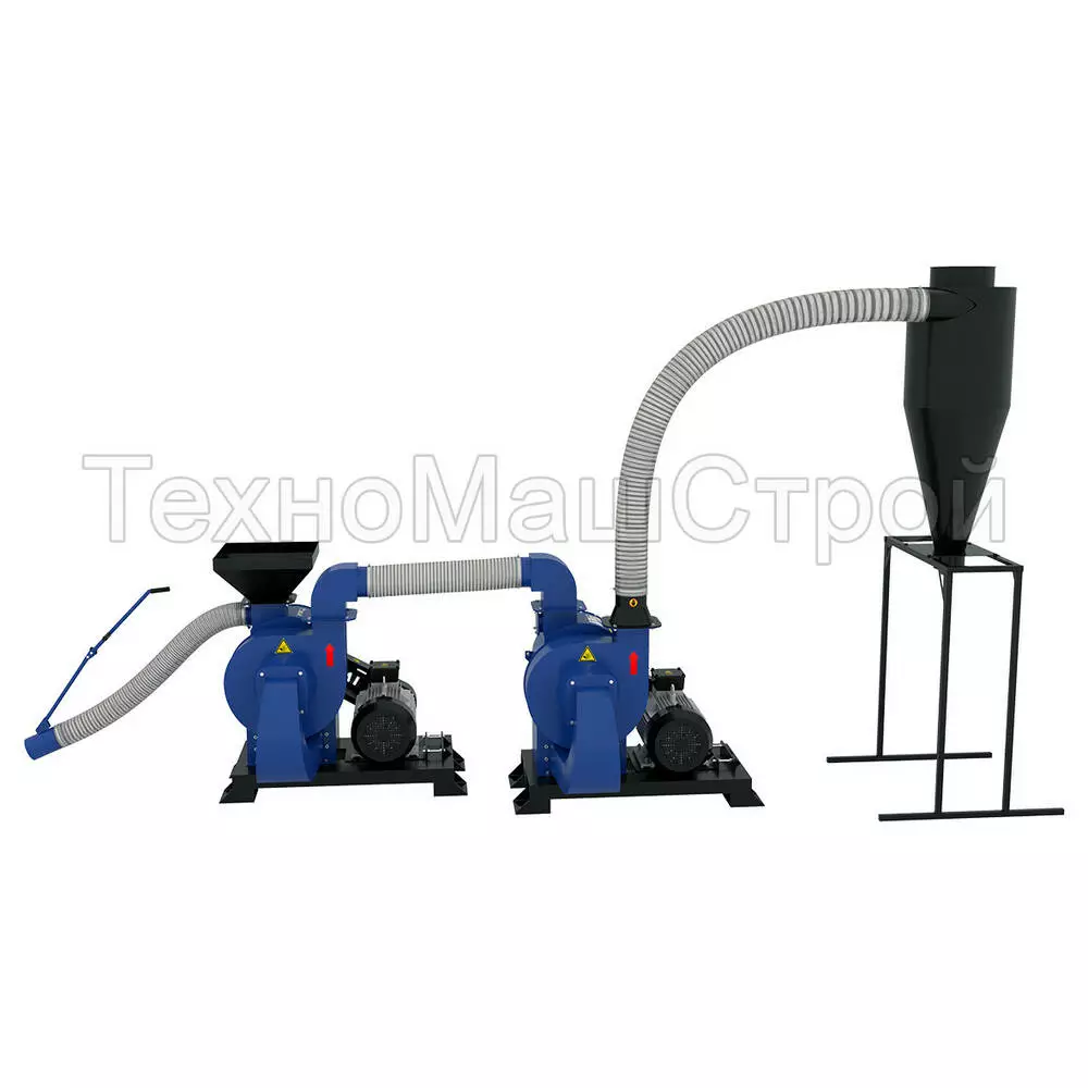 Комплекс молоткових дробарок CHOPPER DUO від компанії "ТехноМашСтрой" призначений для подрібнення відходів деревообробки. У комплекті з кожною дробаркою йде гофро-труба діаметром 160 мм. і довжиною 3 м. Принцип роботи даного комплекту полягає в наступному. У першій молотковій дробарці Chopper-600, потужністю 30 кВт, встановлено сито з отворами 12 мм. Ця дробарка здійснює чорнове подрібнення і за допомогою пневмовикиду сировина потрапляє до другої дробарки Chopper-600, також потужністю 30 кВт, на якій уже встановлено сито з діаметром отворів 6 мм. З цієї дробарки сировина через циклон виходить назовні і може бути використана для гранулювання.