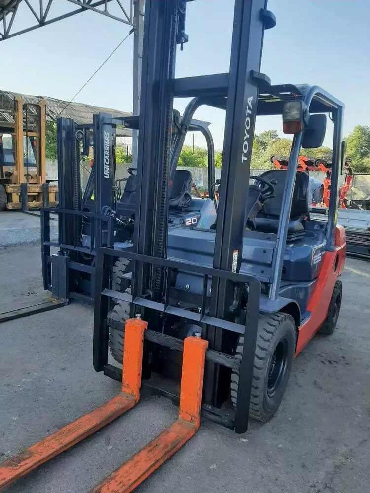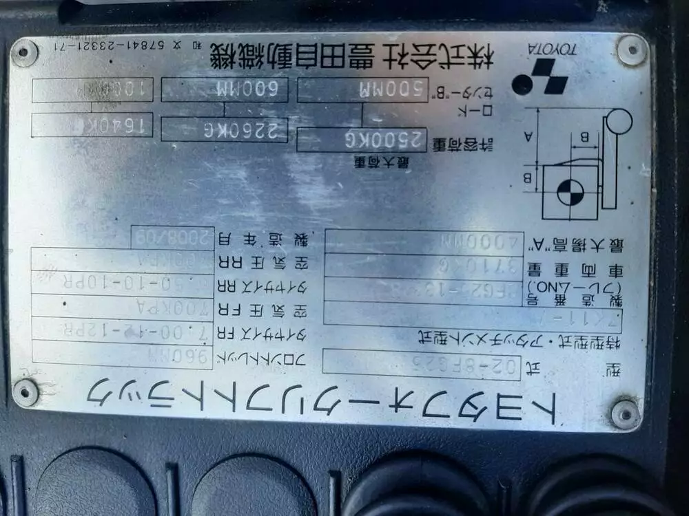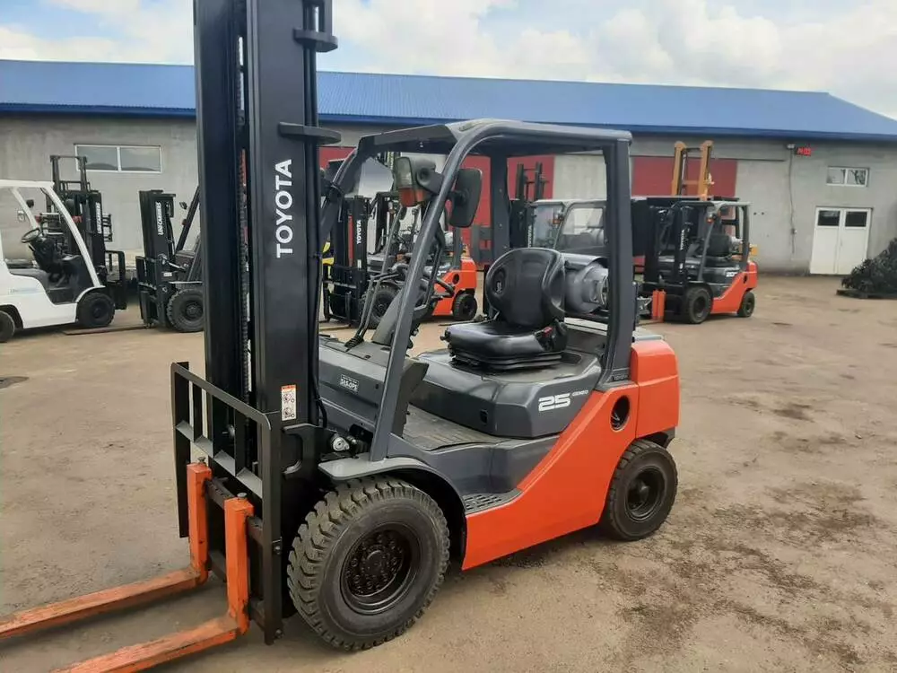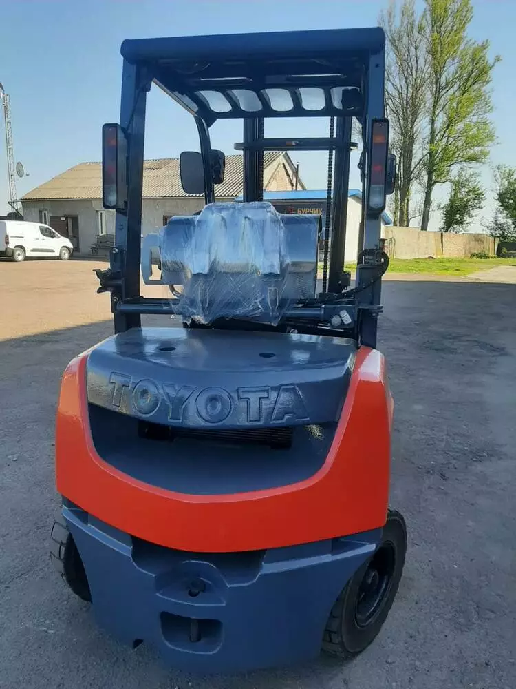 Вилковий навантажувач Toyota 8 покоління 02-8FG25 з вантажопідйомністю до 2,5т, 2008 р.в. тип палива газ/бензин, японського виробництва. Мачта 2-х секційна - з вільним ходом, шина пневматична передня, задня гусматична, пробіг 6740 мот/год, піднімає вантажі на висоту до 3м, мотор toyota 4y. Ціна з ПДВ. Можлива заміна мачти на трьохсекційну з висотою підіймання вантажів до 4,5м.