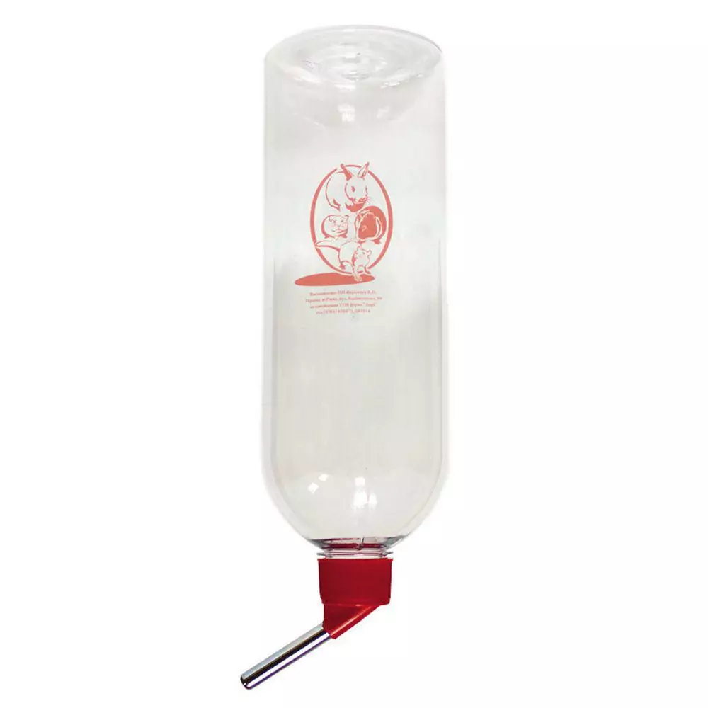 Пластикова поїлка для дрібних гризунів об'ємом 1 л з металевим носиком, всередині якого дві кульки, забезпечує дозовану і безперебійну подачу води при механічному контакті.