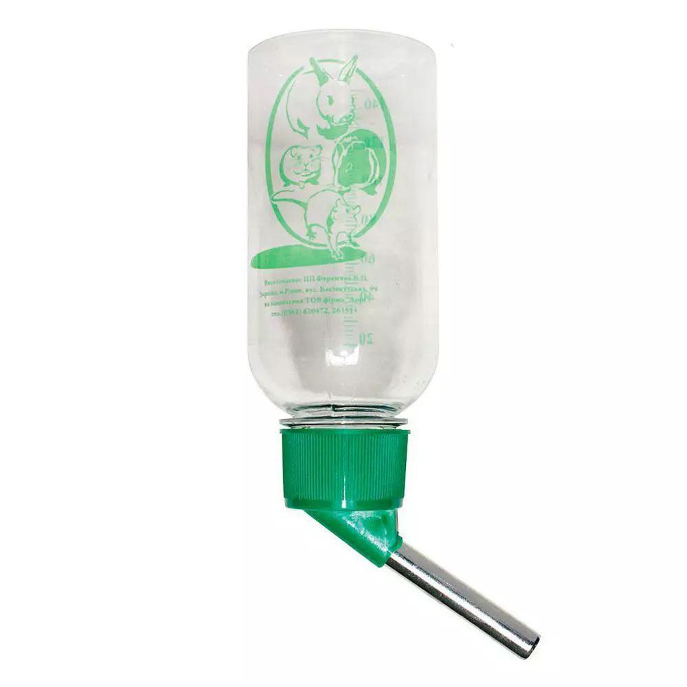 Пластикова поїлка для дрібних гризунів об'ємом 150 мл з металевим носиком, всередині якого дві кульки, забезпечує дозовану і безперебійну подачу води при механічному контакті.