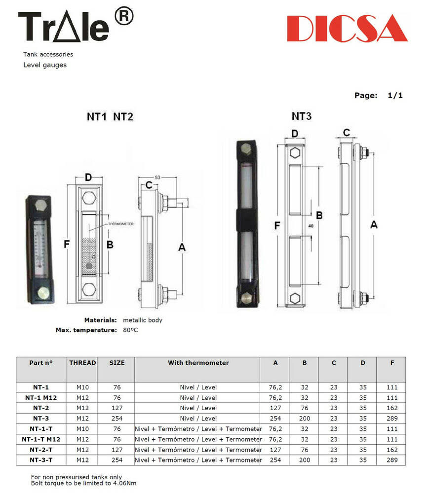 Візуальний оливоуказівник L = 76 мм із різзю М12 (є також різь М10) від виробника DICSA Іспанія (з термометром) застосовується для індикації рівня оливи в гідробаку та температури оливи. Максимальна температура оливи 80 градусів.