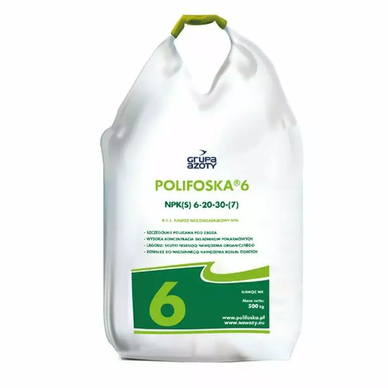 Полифоска 6 NPK(S) 6-20-30-(7) – Удобрение подходит для всех сельскохозяйственных культур как для основного, так и для припосевного внесения; Идеально подходит культурам, требующих усиленного калийного питания, особенно техническим и масляным. Также удобрение эффективно на бедных калием почвах. Все элементы питания, содержащиеся в каждой грануле удобрения (азот, фосфор, калий и сера), находятся в максимально доступной форме для растений.Содержание: азота N-6%, Фосфора P-20%, Калия К-30%, Серы S-7%Производитель: Grupa azoty ПольшаУпаковка: 500 кг.