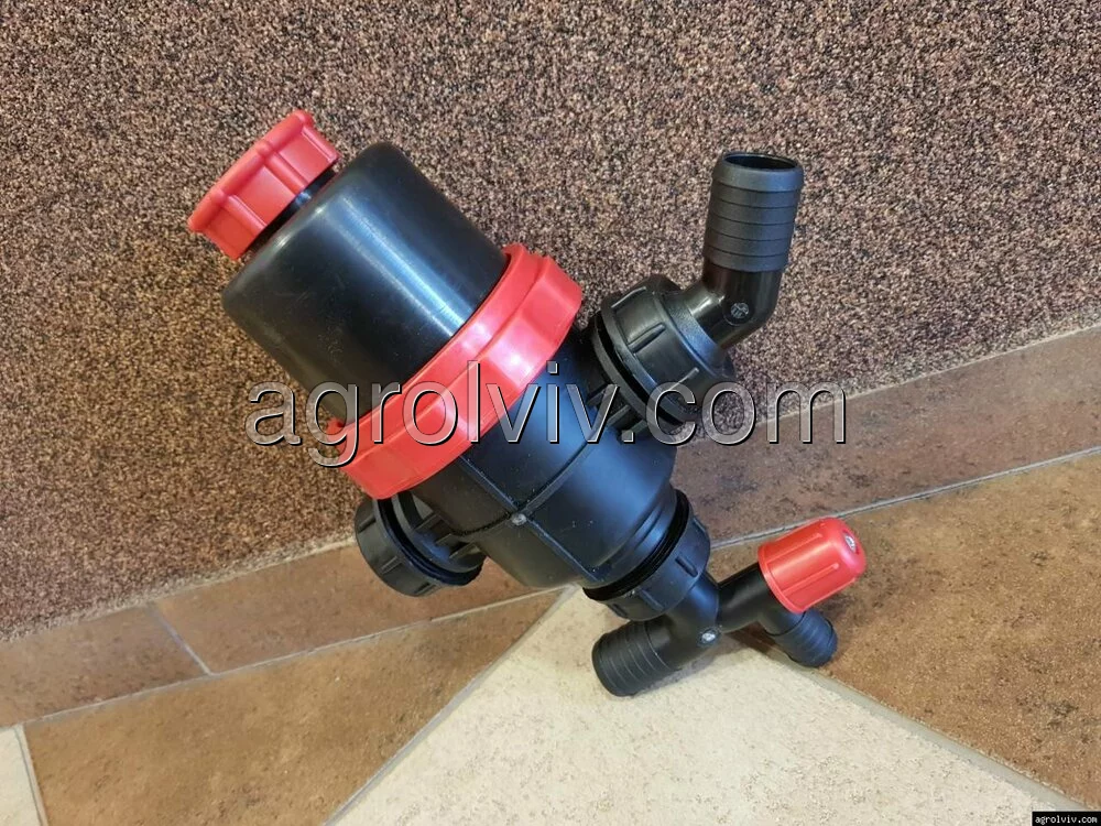 Внизу фільтра оприскувача є зливний кран. З його допомогою можна легко злити залишки хімії з бочки оприскувача в менші ємності.