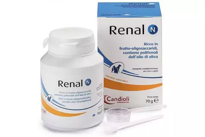 Ренал N - бореться з оксидативного стресу, знижує артеріальний тиск і продукцію азотистих сполук. У своєму складі містить поліфеноли оливкового масла які здійснюють антиоксидантну і антигіпертензивний дії, знімають вазоконстрикцию і запалення з судин. коротко ФОС + Ентерококкус феціум покращує функціонування кишечника і знижує продукцію азотистих метаболітів. Renal N; містить Вітамін С, який адсорбує залізо, а вітаміни групи В; стимулюють синтез гемоглобіну та еритроцитів, контролюючи хронічну нерегенеративного анемію і нейтралізують вільні радикали в нирках. Переваги: змінює склад і активність кишкової мікрофлори; збільшує виробництво летких жирних кислот (масляна, пропіонова) і сприяє розвитку біфідо- і лактобактерій, в той же час знижуючи присутність патогенних бактерій в тому числі клостридій; знижує доступність до субстратів корисним для метаболізму патогенних бактерій, тим самим знижуючи синтез токсинів отриманих внаслідок перетравлення білків (аміак, індол, фенол, аліфатичні аміни, сполуки сірки); регулює мікрофлору, покращуючи зростання сапрофітних бактерій; знижує синтез індоксіл сульфату і Р-крезолу - двох важливих уремічний токсинів; Ренал Р (з їжею) і Ренал N (не має значення) дозування: Порошок до звичайного корму додають в пропорції 0,2 гр на 1 кг маси тіла тварини курсом 30 днів із можливим повторенням, розділяючи добову норму на 2 - 3 прийоми: 1 маленька мірка - 2,5 кг 1 велика мірка - 10 кг