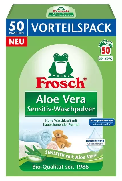 Frosch Sensitiv Aloe Vera — це якісний екологічний пральний порошок, розроблений спеціально для людей із чутливою шкірою та алергіків.