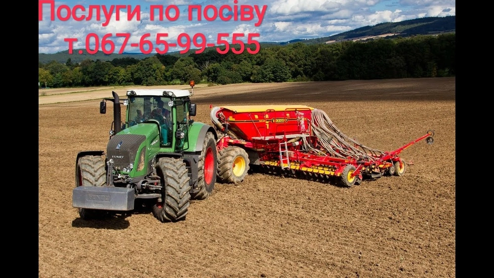 Послуги надаються трактором FENDТ 936 Vario в агрегаті з сівалкою суцільного посіву Vaderstad Rapid 600C (укомплектована передпосівним дискатором, сівалка з внесенням мінеральних добрив).