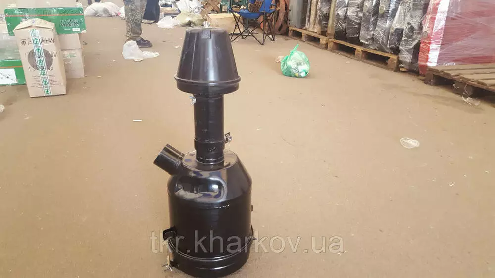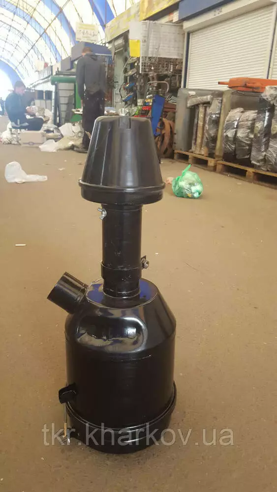 Опис Повітряний фільтр двигуна (повітряноочисник) для трактора МТЗ, ЮМЗ у зборі 240-1109015-А-02. Повітряний фільтр складається із сухого очисника, корпусу та фільтрувального елемента. Корпус фільтра має головку та центральну трубу. У нижній частині корпусу розміщується піддон, заповнений олією, який кріпиться до корпусу стяжними гвинтами. У піддоні встановлена олійна ванна, форма якої забезпечує гарну циркуляцію оливи та унеможливлює внос його в двигун. Повітря з довкілля надходить знизу на завищувач очищувача та набуває обертального руху. Великі частинки пилу під дією відцентрової сили відкидаються до поверхні корпусу очисника та через щілини викидається в атмосферу. Потім частково очищене повітря спрямовується в центральну трубу та під час виходу з неї, ударяючись об поверхню олії, різко змінює напрямок руху. пилу водночас осідають в оливу, а потік повітря рухається через фільтрувальні елементи, де остаточно звільняється від найдрібніших порошинок і надходить у циліндри двигуна. Повітряні фільтри двигунів тракторів МТЗ-50 і ЮМЗ-6Л/М мають такий же пристрій, як і повітряні фільтри двигунів тракторів МТЗ-80, МТЗ-82.