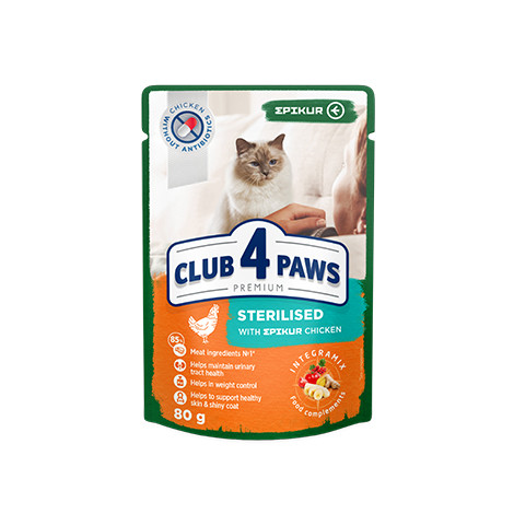 Повнораціонний консервований корм для дорослих Стерилизованих котів CLUB 4 PAWS PREMIUM Курка в соусі 80 г