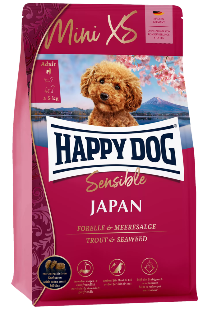 Корм Happy Dog Mini XS Japan - це повнораціонний корм для дорослих собак дрібних і дуже дрібних порід. Унікальна композиція зі смачної форелі, курки та морських водоростей стане насолодою для маленьких собак.