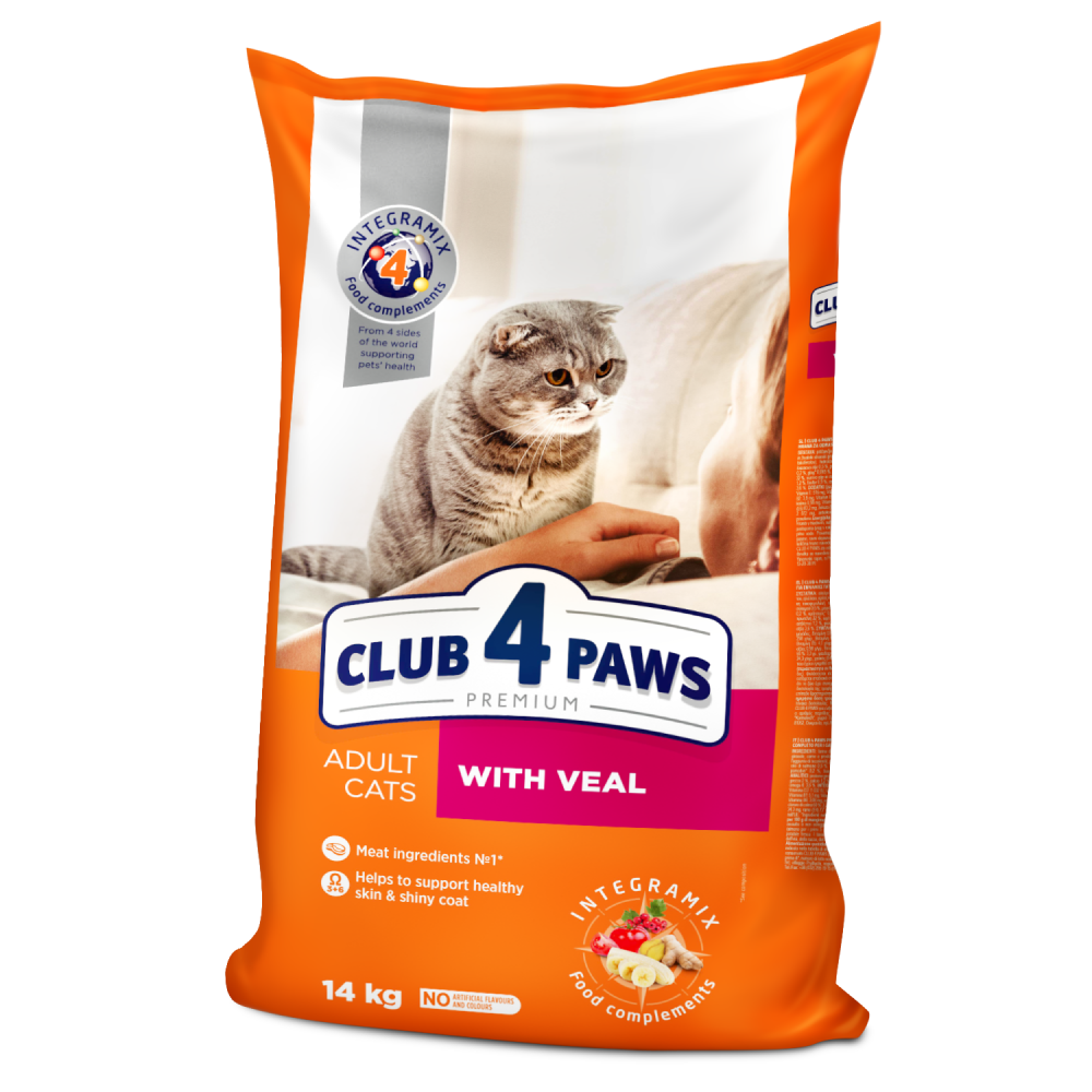 Сухий преміум раціон Club 4 Paws містить 32% м'ясних інгредієнтів на першому місці в складі. Хрусткі гранули з телятиною дуже подобаються дорослим кішкам. Комплекс ненасичених жирних кислот Омега-3 + Омега-6 підтримує шкіру здоровою, а шерсть блискучою. Раціон збагачено формулою INTEGRAMIX для загальної підтримки здоров'я та імунітету улюбленця.