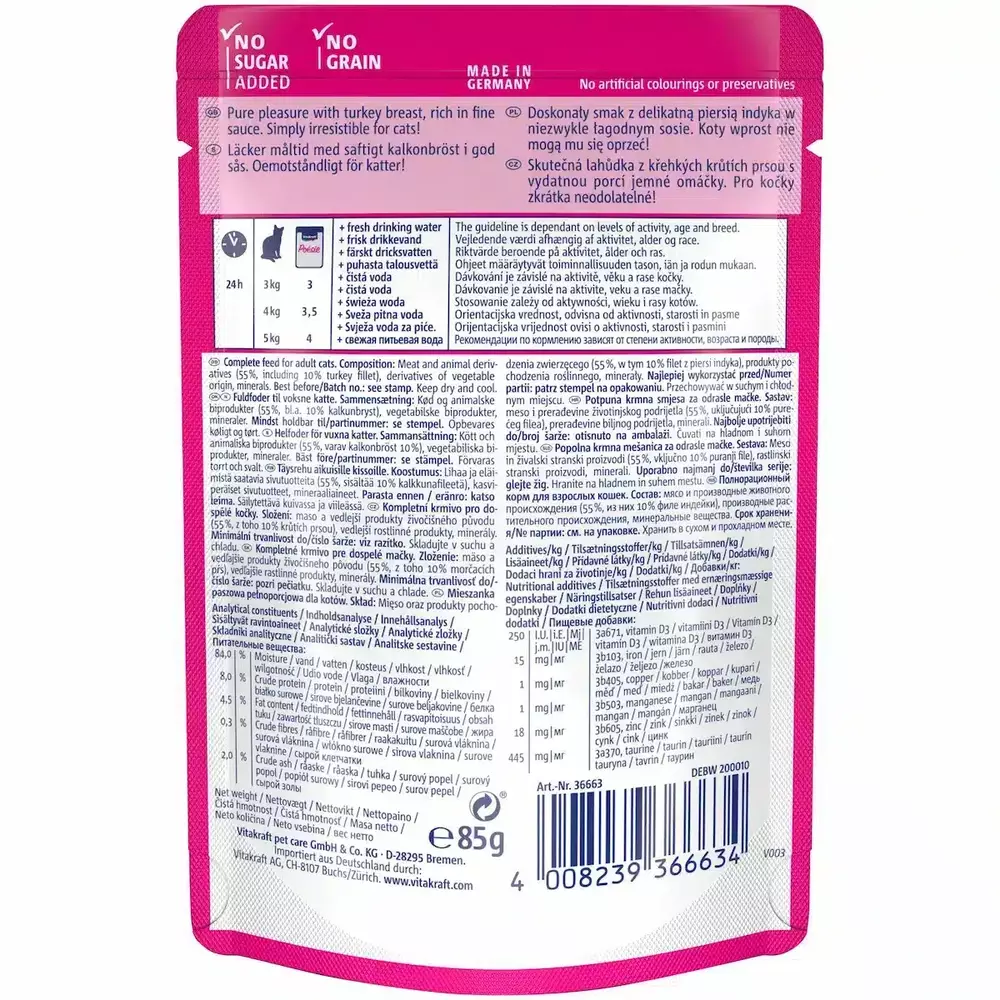 Vitakraft Poésie Délice – ці смачні шматочки з ніжною індичкою в делікатному соусі подарують моменти справжнього задоволення для котика. Найкращі інгредієнти гарантують найвищу якість і ідеально відповідають потребам котика.