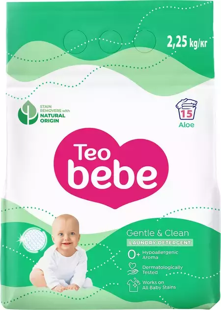 Спеціалізовані пральні порошки Teo bebe Gentle & Clean призначені для догляду за дитячою білизною. Спеціальна формула не містить жодних відомих алергенів, відмінно виводить плями та безпечна навіть для новонароджених дітей.