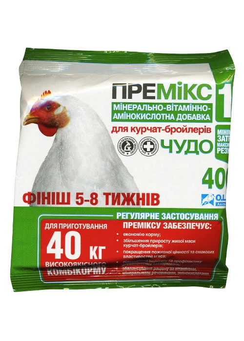 Дія мінерально-вітамінної добавки (преміксу) для бройлерів Фініш 5-8 тижнів зумовлена властивостями окремих компонентів (вітамінів, мікроелементів), які сприяють нормалізації обміну речовин в організмі, позитивно впливають на продуктивність і збереженість птиці.