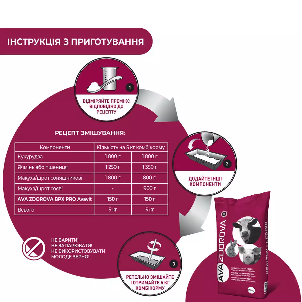 AVA ZDOROVA ВРХ PRO Avavit відповідає стандарту ЗДОРОВА ГОДІВЛЯ, розробленому під потреби і особливості організму ВРХ та ефективний для годівлі високопродуктивних сучасних порід.