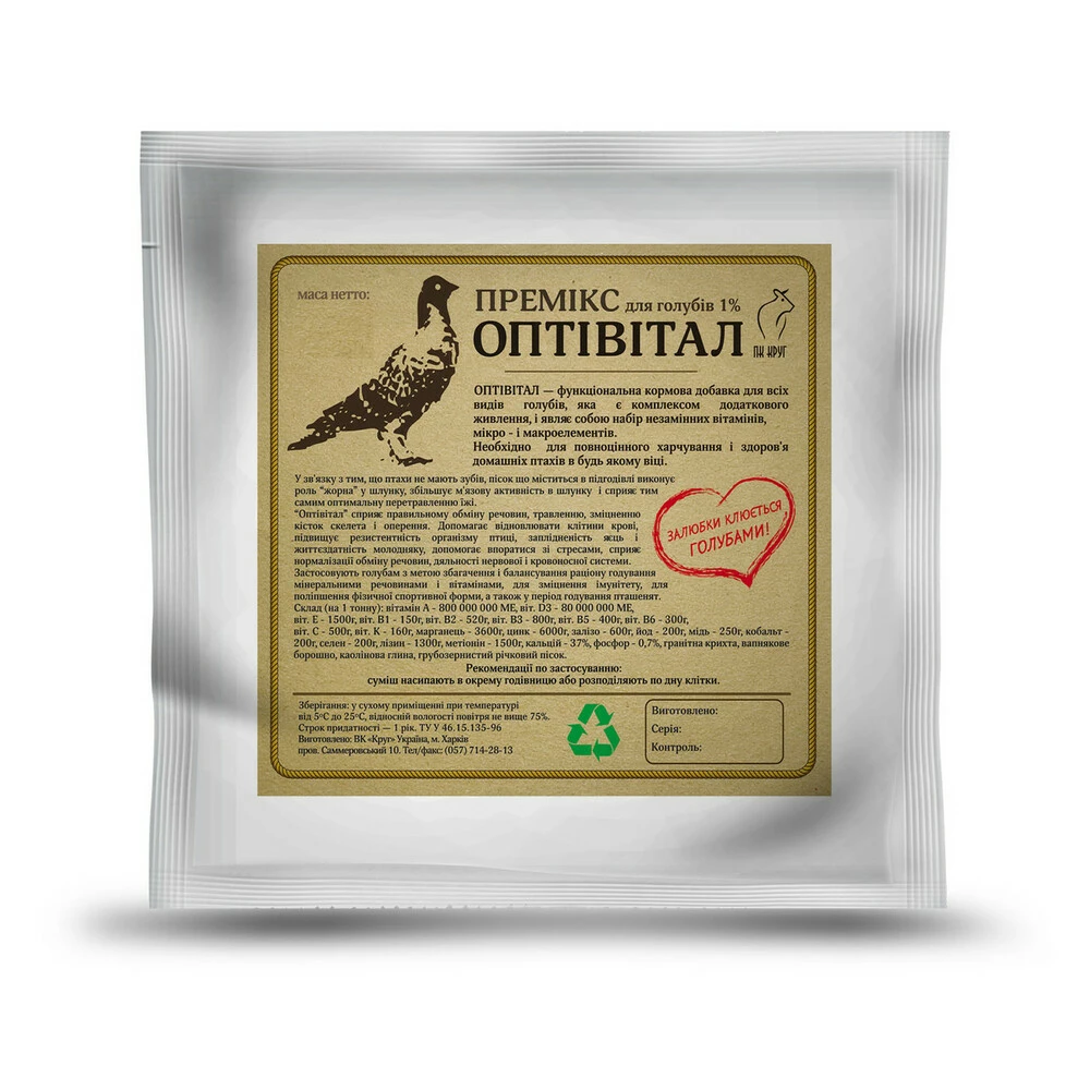 Премікс «Оптивитал» призначений для збагачення та балансування раціону голубів вітамінами і мінеральними речовинами, зміцнення імунітету, поліпшення фізичної форми птахів, а також рекомендований голубам в періоди годування пташенят.