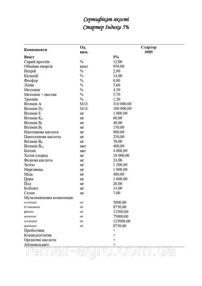 ПРЕМІКС Organica Mix Індик 5% Cтартер -це збалансовані набори вітамінів, мікроелементів, ферментів, джерел фосфору, натрію, амінокислот і спеціально відібраних компонентів, що дозволяють отримати оптимальні показники ефективності.