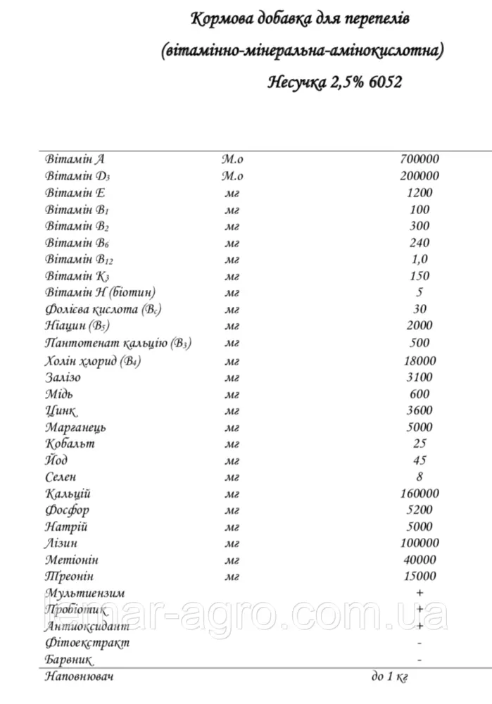 ПРЕМІКС Organica Mix Перепілка 2,5% Несучка -це збалансовані набори вітамінів, мікроелементів, ферментів, джерел фосфору, натрію, амінокислот і спеціально відібраних компонентів, що дозволяють отримати оптимальні показники ефективності.