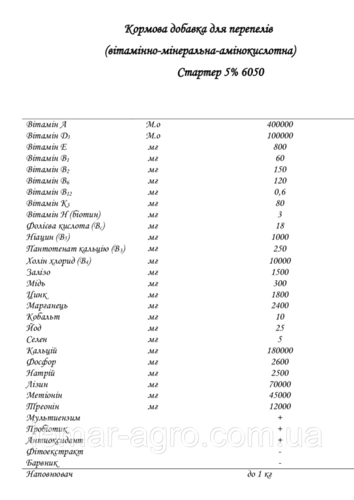 ПРЕМІКС Organica Mix Перепілка 5% Стартер-це збалансовані набори вітамінів, мікроелементів, ферментів, джерел фосфору, натрію, амінокислот і спеціально відібраних компонентів, що дозволяють отримати оптимальні показники ефективності.