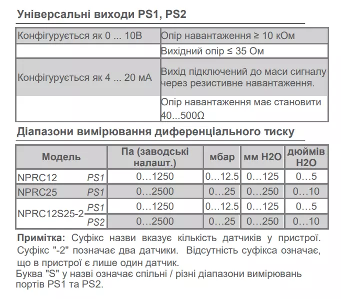 NPRCxxx (-2) — перетворювачі диференціального тиску, обладнані одним або двома портами й одним або двома універсальними виходами 0...10 В/4...20 мА.