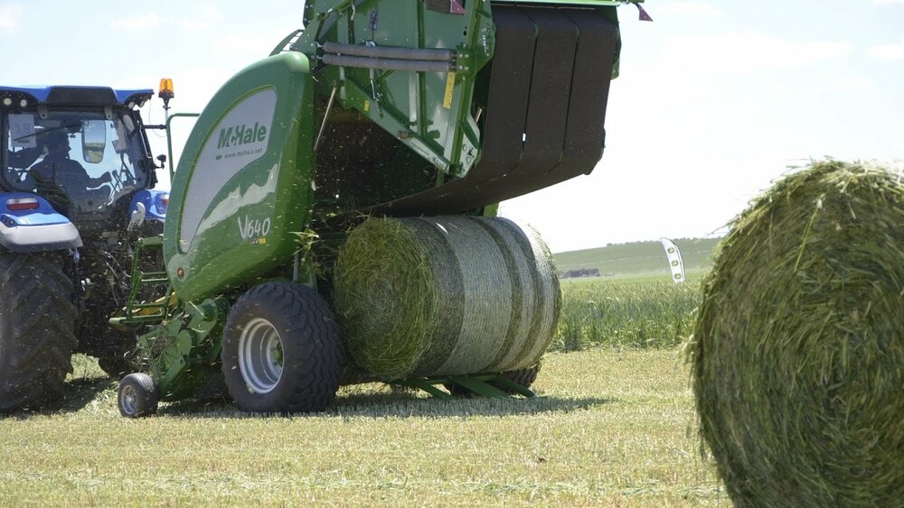 Пресс-подборщик McHale V6740 (обновленная модель V640 без ножей) - это бесшумный ленточный пресс-подборщик. Он имеет возможность создавать тюки высотой от 0,6 м до 1,68 м с использованием 3 тяжелых бесконечных ремней.