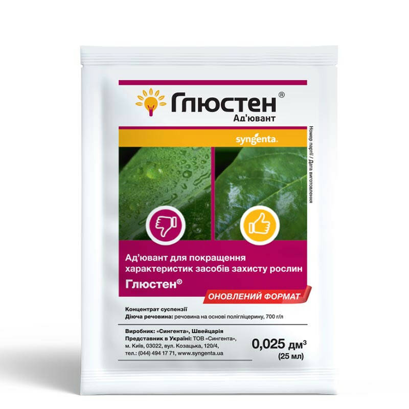Глюстен™ —  ад'ювант, що зменшує ризики фітотоксичності рослин, препарат природного походження, тож безпечний для корисної ентомофауни. Покращує ефективність засобів захисту рослин як у типових, так і в складних умовах. Забезпечує надійне утримання крапель робочого розчину, його поширення, посилює поглинання рослиною без ризику стікання.