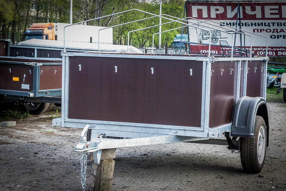 Прицеп "Палыч" (Хамер - Люкс) Оцинкованный: одноосный, рессора 5-листовая, амортизаторы, дышло треугольное, задний и передний борт открывается, днище и борта прицепа влагостойкая ламинированная фанера, рама усиленная оцинкована горячим цинком, борта в рамке из квадратной трубы 25х25. Полная масса 750 кг. Размер платформы 1250 мм. на 2150 мм. Высота борта: 600 мм. Ступица: ВАЗ-2108 с двухрядным необслуживаемым подшипником. Прицеп оснащен всей необходимой светотехникой.