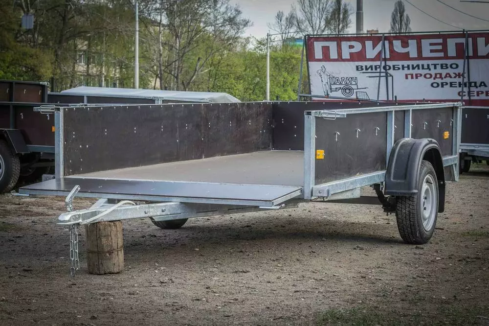 Прицеп "Палыч" (Хамер - Люкс) Оцинкованный: одноосный, рессора 5-листовая, амортизаторы, дышло треугольное, задний и передний борт открывается, днище и борта прицепа влагостойкая ламинированная фанера, рама усиленная оцинкована горячим цинком, борта в рамке из квадратной трубы 40х25. Полная масса 750 кг. Размер платформы 1250 мм. на 2500 мм. Высота борта: 400 мм. Ступица: ВАЗ-2108 с двухрядным необслуживаемым подшипником. Прицеп оснащен всей необходимой светотехникой.