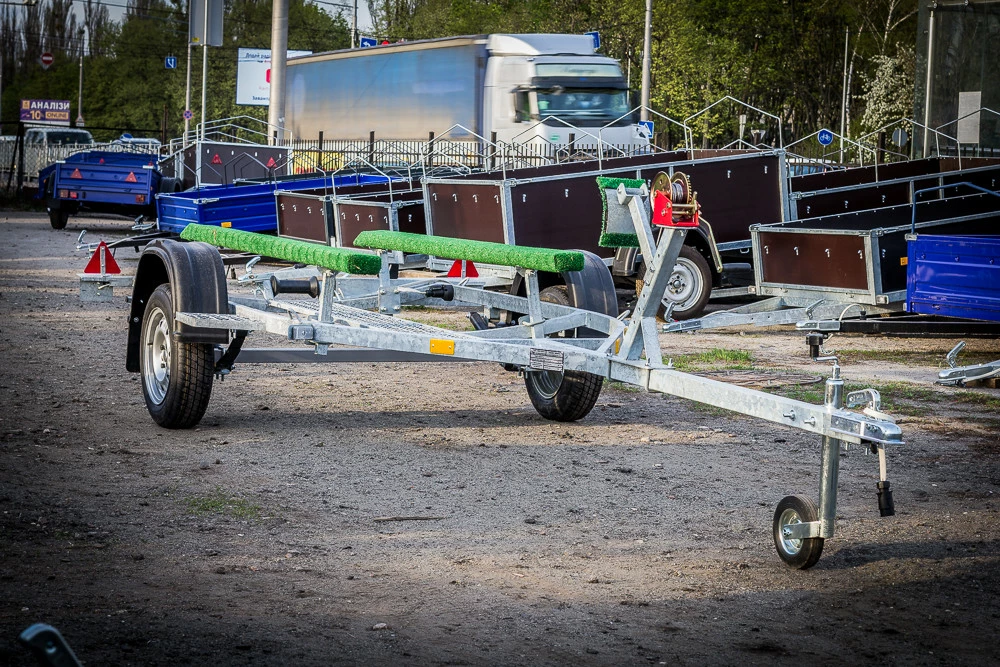 Прицеп "Палыч" Оцинкованный: Для перевозки резиновых лодок, ПВХ лодок, лодок типа RIB а также лодок с жёстким дном. На рессорной подвеске с амортизаторами. Прицеп усиленный, рама оцинкована горячим цинком. Длина перевозимой лодки до 3,8 м, ширина перевозимой лодки до 2 м. Ширина прицепа по раме (между крыльями) 1,35м. Длина ложементов 2,1м. Регулируемый носовой упор, лебёдка 450 кг., подкатное колесо, один закатный ролик, крылья пластиковые, Ступица ВАЗ-2108 с двухрядным необслуживаемым подшипником. Трап вдоль всего прицепа, бампер со светотехникой съемный.