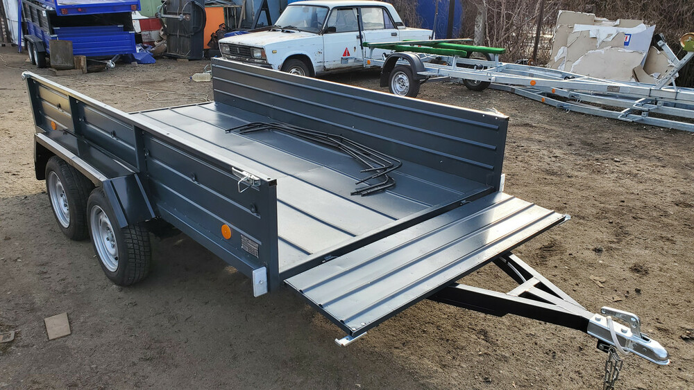 Прицеп "Палыч" (Хамер): двухосный, рессора 5-листовая (усиленная), амортизатор ВАЗ 2101, дышло треугольное, задний и передний борт открывается, рама усиленная цельносварная. Полная масса 750 кг. Толщина металла на бортах и днище 1мм. Ступица: ВАЗ-2108 с двухрядным необслуживаемым подшипником. Прицеп оснащен всей необходимой светотехникой.