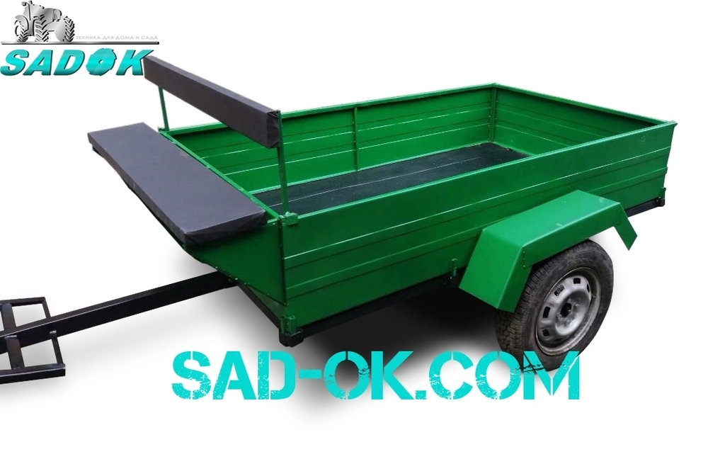 Сиденье на всю ширину прицепа, оборудовано спинкой и ящиком для инструментов. На дышле есть упор для ног и педаль механического тормоза.