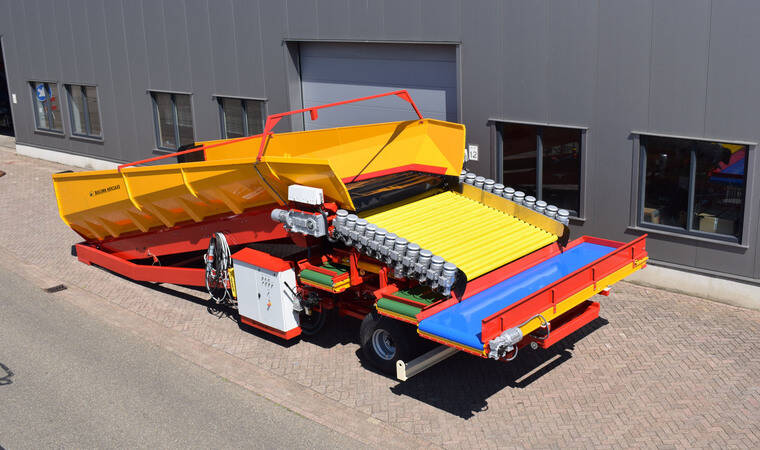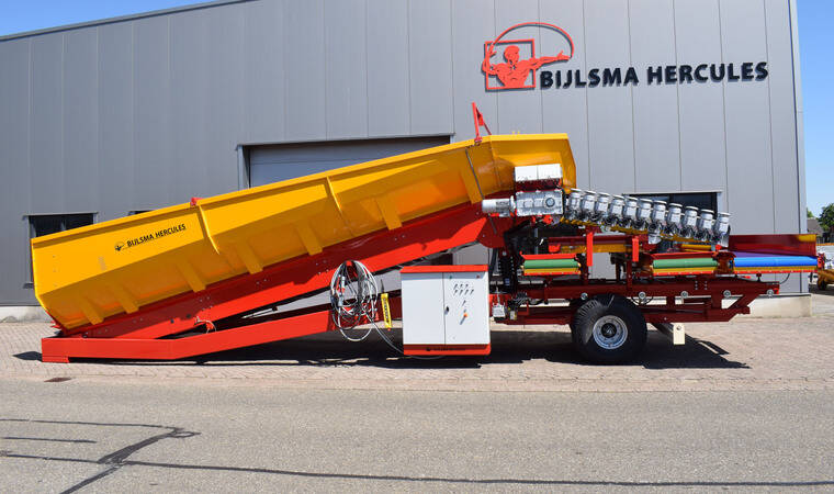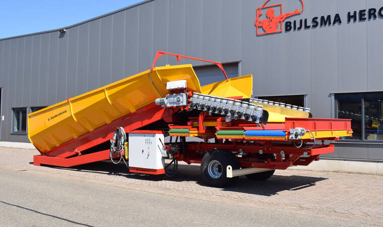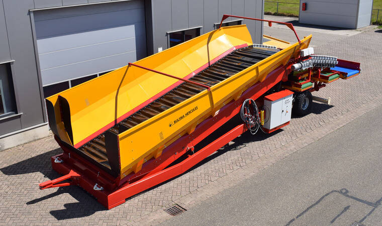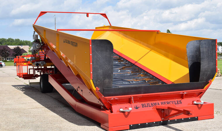 Конструкція, що згинається, на розвантажувальній стороні розвантажувальної підлоги забезпечує оптимальний перехід між бункером і очищувачем продукту з мынымальни перепадом висоти. Донний транспортер складається з двох посилених роликових ланцюгів із встановленими між ними поперечними планками. Завдяки тому, що тканина з поліестеру та нейлону закріплена на планках із надлишком довжини, на донному транспортеры утворюються "кишені" що запобігають відкочуванню продукту. Розвантажувальний транспортер приводиться в дію електродвигуном, встановленим безпосередньо на редукторі. Це призводить до кращої передачі потужності. Швидкість розвантажувальної підлоги плавно регулюється. За бажанням система може бути розширена за рахунок автоматичного регулювання продуктивності. Цей блок управління підключений до перетворювача частоти і складається з датчика ультразвукового вимірювання товщини шару продукту на стрічці і ПЛК.