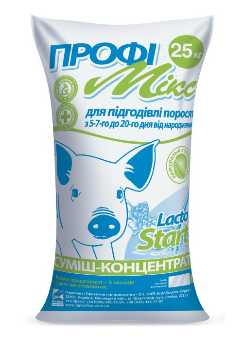 Суміш-концентрат ПрофіМілк «LactoStart» виготовлено на основі бобових, олійних та зернових компонентів з додаванням продуктів переробки молока, збагачено комплексом біологічно-активних речовин (вітаміни, макро-, мікроелементи), пробіотичним комплексом, смаковими та ароматичними речовинами, що підвищують апетит у тварин. Продукт не містить консервантів, стабілізаторів, антибіотиків та ГМО.
