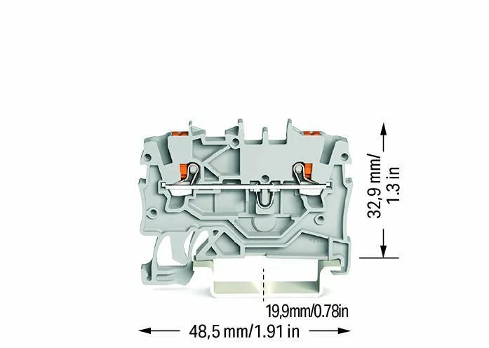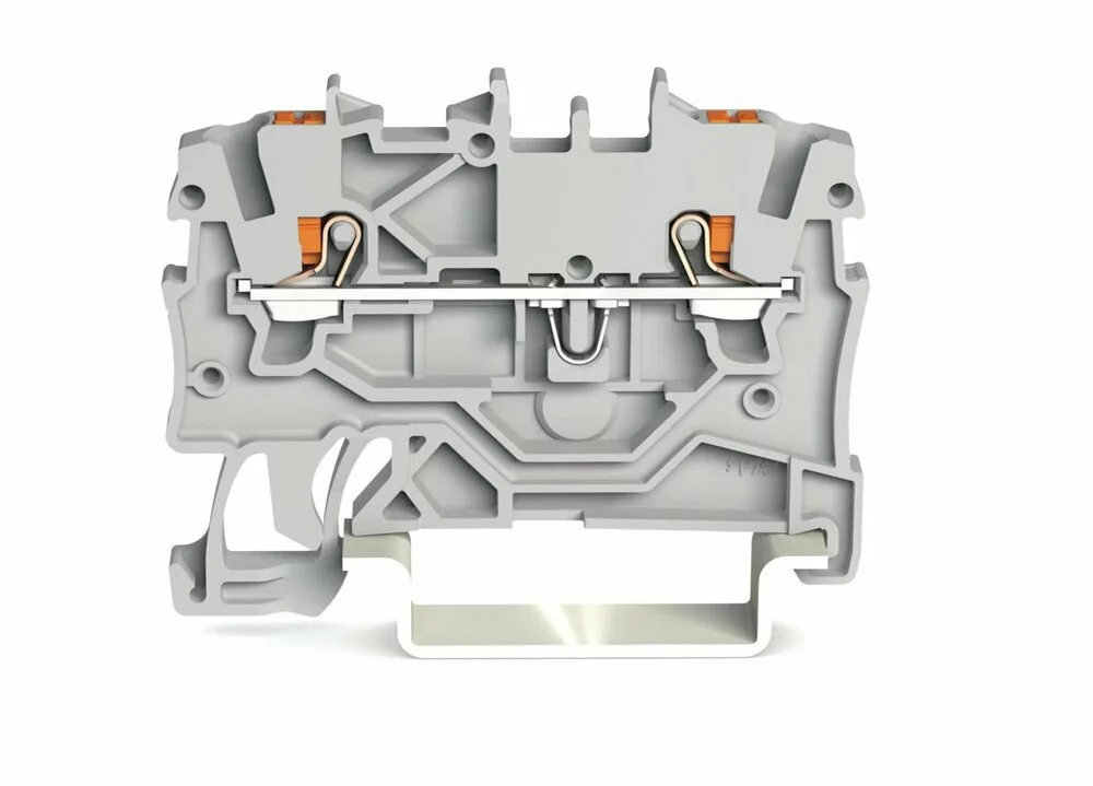 Прохідні клеми Wago 2-дротяні з нажимной кнопкою 1 мм²; з тестовим портом; бічна і центральна маркіровка; для DIN- рейки 35 x 15 і 35 x 7,5; Push - in CAGE CLAMP®; 1,00 mm²; сірі.