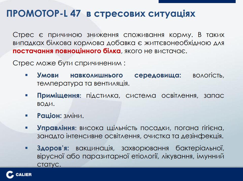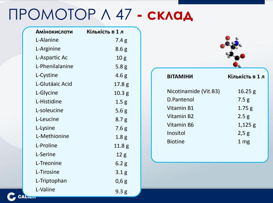 Промотор Л містить усі вітаміни та амінокислоти, які є життєво необхідними для правильного функціонування організму. Рідка форма Промотор Л забезпечує випиювання з автоматичних напувалок без ускладнень. Промотор Л забезпечує організм усіма амінокислотами, які отримані в L - формі і є природними та у вільній формі. За даними характеристик цей продукт забезпечує всі потреби організму тварини, швидко повністю засвоюється і діє.