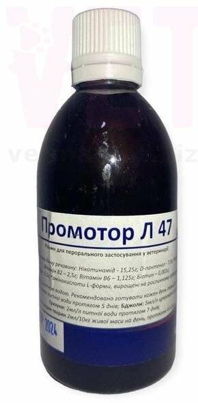 Промотор Л содержит все витамины и аминокислоты , которые являются жизненно необходимыми для правильного функционирования организма. Жидкая форма Промотор Л обеспечивает выпойки из автоматических поилок без осложнений. Промотор Л обеспечивает организм всеми аминокислотами , которые получены в L - форме и являются естественными и в свободной форме. С данным характеристикам этот продукт обеспечивает все потребности организма животного , быстро полностью усваивается и действует.