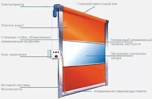 Рама рулонних швидкісних воріт виконана зі сталі, облицьованої декоративним алюмінієвим профілем. У дверному отворі є фотоелемент безпеки. Нижній край воріт посилений, з "чутливої ​​кромкою" для захисту від пошкодження при зіткненні з перешкодою.