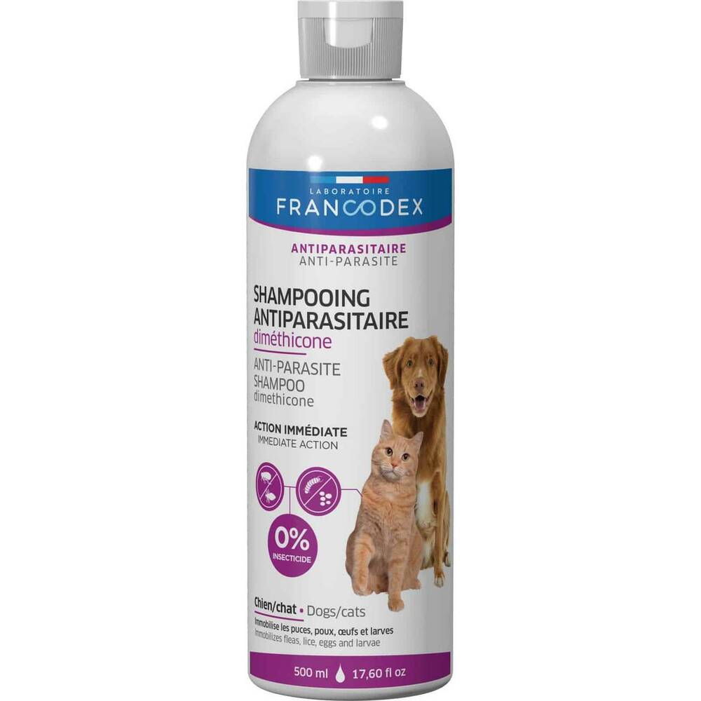 ПРОТИПАРАЗИТАРНИЙ ШАМПУНЬ З ДИМЕТИКОНОМ ДЛЯ КОТІВ І СОБАК LABORATOIRE FRANCODEX (Лаборатуар Франкодекс) чинить миттєву механічну дію на паразитів: диметикон діє як пастка, що ловить паразитів. Вони більше не можуть рухатися і падають з тварини або видаляються під час розчісування шерсті.