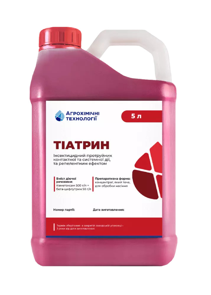 Протруйник Тіатрин - високоефективний інсектицидний протруйник контактної та системної дії, з репелентним ефектом. Забезпечує тривалий захист насіння та сходів від основних наземних та ґрунтових шкідників (совки, дротяники, жужелиці та ін.)