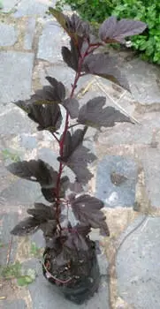 Опис взятий з інтернету: Physocarpus opulifolius 'Diablo' Пухироплідник калинолистий Пухироплідники - популярні листопадні кущі, які, в залежності від сорту, різняться кольором листя, формою та висотою. Сорт Дьябло (Diablo), як підказує його назва, має насправді диявольське темнобагряне забарвлення листя протягом усього сезону. Суцвіття медоносних рожевуватих квітів не такі привабливі як плоди, винно-червоний колір яких на фоні темного листя помітний вже здалеку. Ідеться про чудовий, дуже витривалий сорт, який, завдяки своєму гарно забарвленому листю, займає перші місця у рейтингу популярності у садових фірмах та ландшафтних дизайнерів. Він трохи вищий за свого золотолистого "колегу", тому для отримання компактного куща треба його формувати ще коли рослина молода. Типова схема - в одиин рік дати вирости довгим вертикальним пагонам, які наступного року приростуть бічними пагонами і трохи відігнуться вбік, утворивши ефект легкого провисання. Пухироплідник дуже невибагливий до умов та грунту. Його коренева система настільки жорстка, що легко укоріниться навіть в важкому, глинистому грунті. Темні сорти найкраще виглядатимуть у комбінації з світло-зеленими та золотистими листяними кущами, або при висадці перед світлою стіною чи парканом - так колір листя буде контрастувати з фоном. Обрізка не обов'язкова, пухироплідник сам чудово відрощує нові густі пагони. Для насиченого кольору листя краще висаджувати на сонці, але рослина чудово росте і в тіні. Джерело :