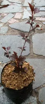 Опис взятий з інтернету: Пухіропличник калінолистій Саммер Вайн Бульбашник калінолистий Саммер Вайн Physocarpus opulifolius Summer Wine Синоніми: Фізокарпус калинолистный, Пухироплідник калинолистный Літнє Вино, Пухироплідник Самме Вайн. Походження / історія: Природний ареал Пухироплідника калинолистного Північна Америка і Східна Азія. Пухироплідник Саммер Вайн нова декоративна форма пухироплідника, виведена шляхом схрещування сортів Диаболо і Нанус, завдяки чому Саммер Вайн вийшов компактніших розмірів з темно-червоним забарвленням листя. Опис сорту /переваги: Декоративно-листяні кущ до 2м у висоту з густою, розкидистою кроною і безліччю пагонів, які трохи згинаються. Винно-червоні листочки серед буйства зелені інших рослин ефектно виділяються і є головним достоїнством цієї дивовижної рослини. Цінується Physocarpus opulifolius Самме Вайн за свою непримхливість, морозостійкість і декоративність, яка не змінна із ранньої весни до пізньої осені. Форма: Розкидиста, щільна з безліччю гілок, що нагадують салют (див. фото). Розмір: Доросла рослина може досягати висоти 2 м і стільки ж в діаметрі. Швидкість росту / сила росту: Приріст складає біля 30 см за сезон. Пагони: Ростуть вгору, а потім згинаються вниз. Кора: У молодих пагонів кора червоняста, пізніше набуває бурий колір, до того ж вона тріскається і відшаровується, надаючи своєрідної краси в зимку. Листя: Схожі на листя калини, витягнуті, трилопатеві, темно-червоні, до середини літа можуть трохи зеленіти. Квітки: Маленькі, рожево-білі квіточки зібрані в щитковидні суцвіття, мальовничо контрастують з винно-червоним листям. Час цвітіння: Квітки починають розпускатися в червні. Плоди: Супліддя, дозрівають у вересні. Відношення до світла / інсоляція: Пухироплідник Саммер Вайн, краще розвивається на сонці. Може рости в тіні або півтіні, але при нестачі світла листя зеленіє. Відношення до вологи: Пухироплідник Саммер Вайн любить помірний полив. Тип грунту / грунту: Підійде будь-який родючий, дренований грунт. Не терпить високих грунтових вод і застою води. Застосування: Пухироплідник Саммер Вайн допомагає створювати вражаючі ландшафтні композиції у водойм, серед каменів, в альпінаріях, міксбордерах, квітниках. Оригінально виглядає він сольно на газоні, як бризки вина. Його часто використовують для живоплоту. Ефектно виглядає мікс з двох різних за кольоровою гамою рослин. Пухороплідник Саммер Вайн стане перлиною у Вашій особистій колекції декоративних рослин! Кліматична зона / зона морозостійкості: 4 – абсолютно вся територія України (5a - 7b) від Закарпаття (5b - 6b) до Луганська (5a-5b) і Криму.