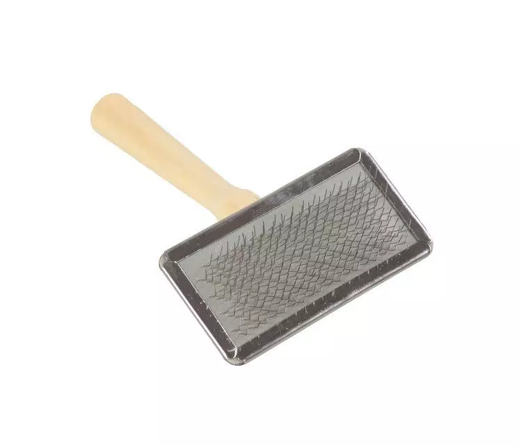 Пуходер з дерев'яною ручкою, колір сірий. Призначений для догляду за вовняним покровом різних видів тварин. Зуби пуходера мають еластичне кріплення. Це сприяє м'якому ходу щітки. Закруглені краї зубів надають масажний ефект, стимулюють кровообіг, не травмують шкіру. Видаляє пух і мертвий волосся. Розмір: 9*13см