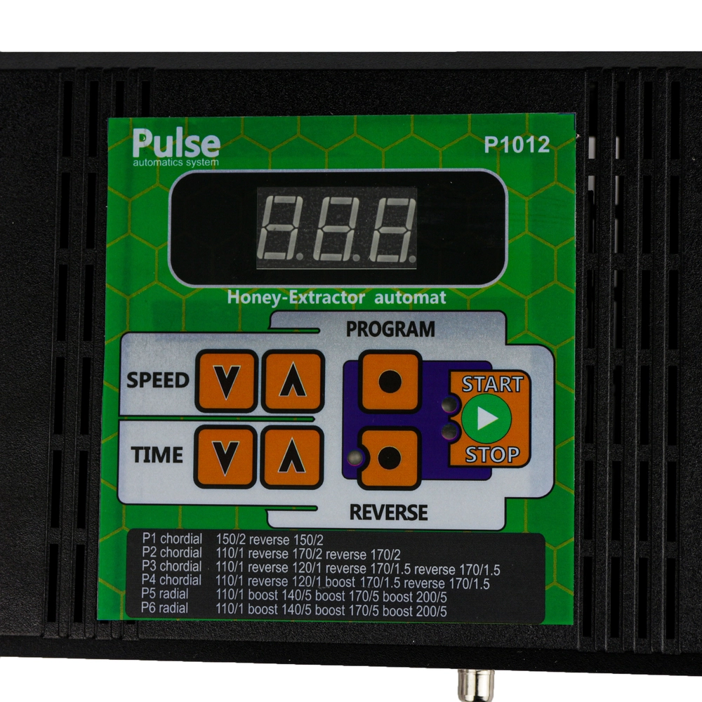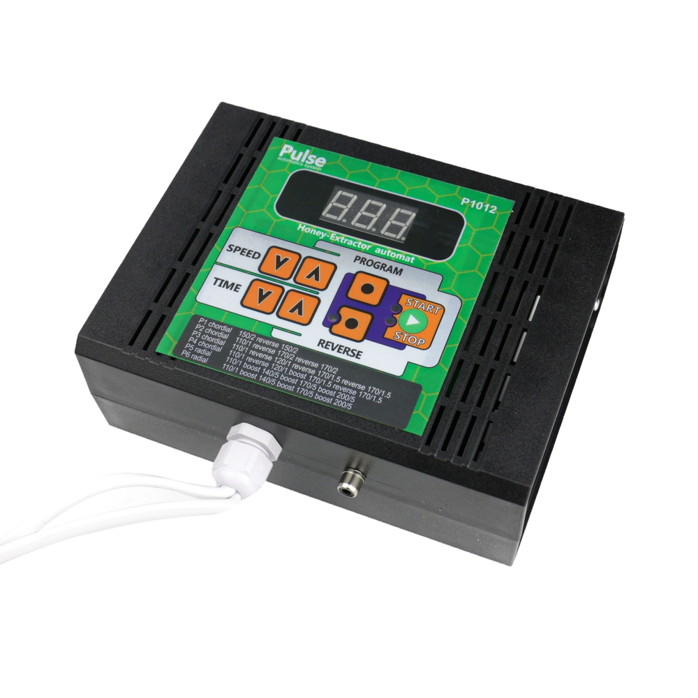 Блок керування медогонки (сенсорний) "PULSE" Блок управління приводу медогонки, навантаження 100вт, механічне управління. Електроніка управління медогонкою, розрахована для безперервного використання з редукторами Pulse. Регулятор оборотів медогонки, дозволяє підібрати потрібні обороти ротора і встановити час відкачування. Установка Встановіть кронштейн пульта управління, у випадку з медогонкою заводу Меліса 93, Melisa 93, на штатні отвори до яких закріплена траверса медогонки, якщо отвори не збігаються рекомендуємо просвердлити нові. У разі якщо у вас інша модифікація медогонки, отвори для монтажу необхідно просвердлити на обручі медогонки, переконавшись, що відстань від роз'ємів редуктора і пульта дозволяє в подальшому виконати з'єднання. Встановіть пульт управління на кронштейн. Пульт управління дозволяє керувати швидкістю обертання ротора медогонки в діапазоні від 50 до 220 оборотів в хвилину, зміна проводиться відповідним регулятором з маркуванням «SPEED» шкала розподілу від 1 до 10 од. Пульт управління дозволяє керувати часом обертання ротора медогонки в діапазоні від 1 до 7 хвилин, зміна проводиться відповідним регулятором з маркуванням «TIME» шкала розподілу від 1 до 7 од. Час роботи встановлюється до натискання кнопки «Старт», під час роботи двигуна зміна часу не активна. Необхідно підібрати: Час розвантаження (той час, при якому відбувається розвантаження встановленої рамки) підбирається в залежності від навколишньої температури, сорту / виду меду, стану бджолиних сот. Як правило, час розвантаження встановлюється від 1 хв до 3 хв. Час відкачування (той час, при якому відбувається відкачка встановленої межі) підбирається в залежності від навколишньої температури, сорту / виду меду, стану бджолиних сот. Як правило, час відкачування встановлюється від 1 хв до 3 хв. Установка напрямку обертання ротора медогонки «REVERSE»: Пульт управління дозволяє управляти напрямком обертання ротора медогонки, реверс здійснюється за допомогою перемикання тумблера «REVERSE» ВАЖЛИВО! Не перемикайте тумблер «REVERSE» під час обертання ротора медогонки! Необхідно дочекатися повної зупинки ротора медогонки, після чого можливе переключення тумблера «REVERSE» При неправильному використанні можливі пошкодження Редуктора і пульта управління! Що є НЕ ГАРАНТІЙНИМ ВИПАДКОМ!