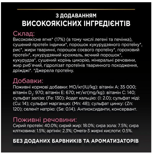Інгредієнти: Високоякісне ягня (17%) (в тому числі легені та печінка), сушений протеїн індички, порошок кукурудзяного протеїну, рис, жири тваринні, порошок соєвого протеїну, гороховий протеїн, кукурудзяний крохмаль, яєчний порошок, кукурудза, сушений корінь цикорію, мінеральні речовини, жир риб′ячий, гідролізат протеїнів тваринного походження, дріжджі.
