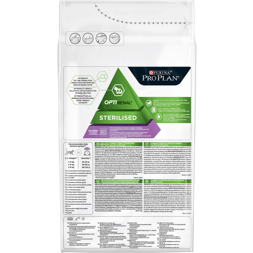 Purina Pro Plan Sterilised спеціально адаптований до знижених енергетичних потреб дорослих кастрованих котів і стерилізованих кішок. Корм забезпечує підтримування ідеальної кондиції, забезпечує нормальну регуляцію метаболізму глюкози та роботи сечовидільної системи. Корм Purina Pro Plan Sterilised, основним інгредієнтом якого є індичка, є повнораціонним збалансованим харчуванням із високими смаковими характеристиками, забезпечуючи кастрованого кота поживними речовинами та зберігаючи його здоров'я. Підтримує здоров'я сечовивідної системи; допомагає підтримувати оптимальну вагу; допомагає захистити зуби від утворення нальоту та зубного каменю. Sterilized (для стерилізованих котів і кастрованих котів. З куркою та індичкою).