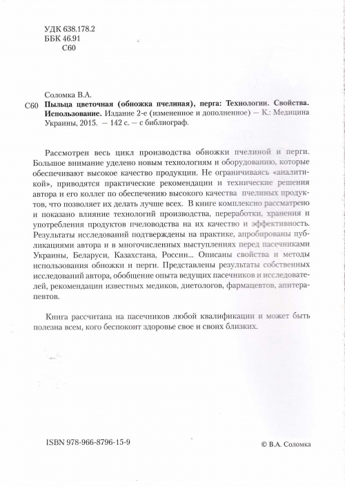 С 60 Пыльца цветочная (обножка пчелиная)/, перга: Технологии. Свойства. Использование. Издание 2 - е (измененное и дополненное) В.А. Соломка. - К.: Медицина Украины, 2015. - 142 с. - с библиограф.