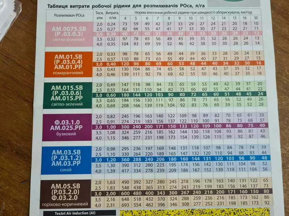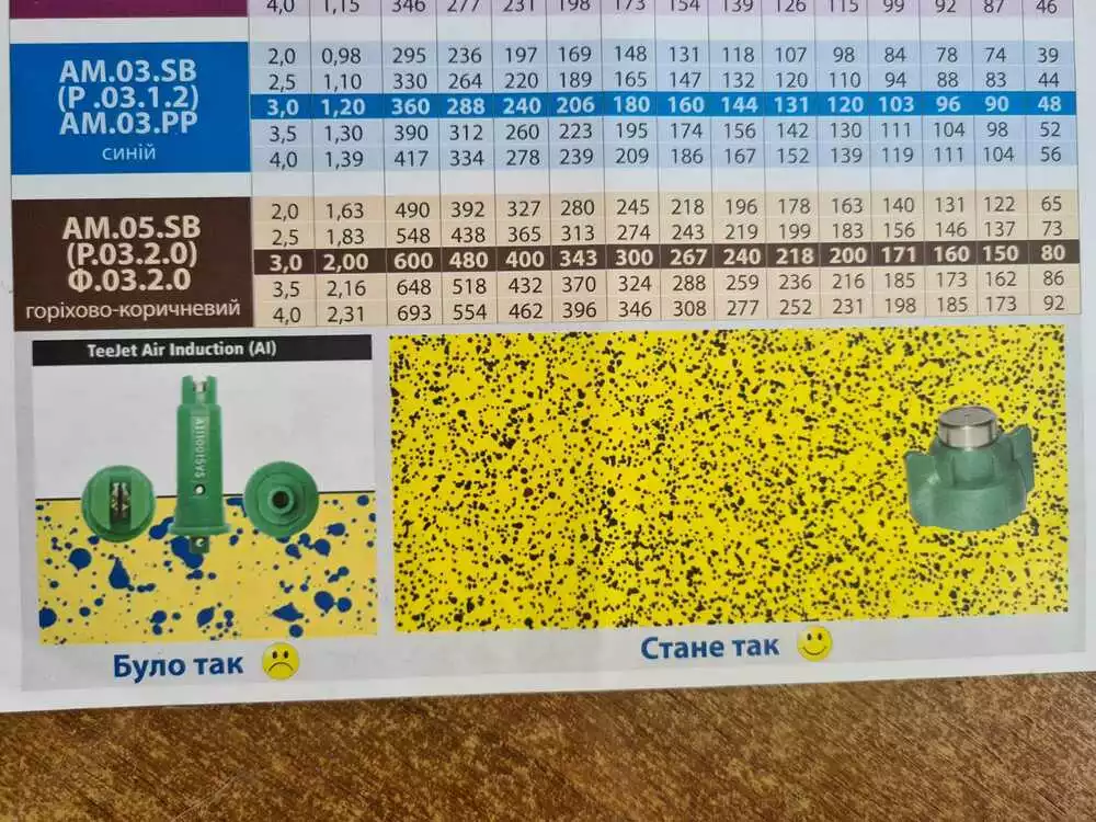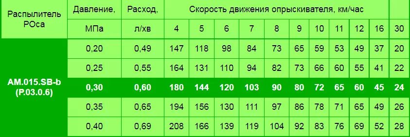 Розпилювачі РОС AM.015.SB на обприскувачі з баком 2000 літрів при швидкості руху 14 км/год дозволяють провести обприскування на площі 40 га однією заправкою.